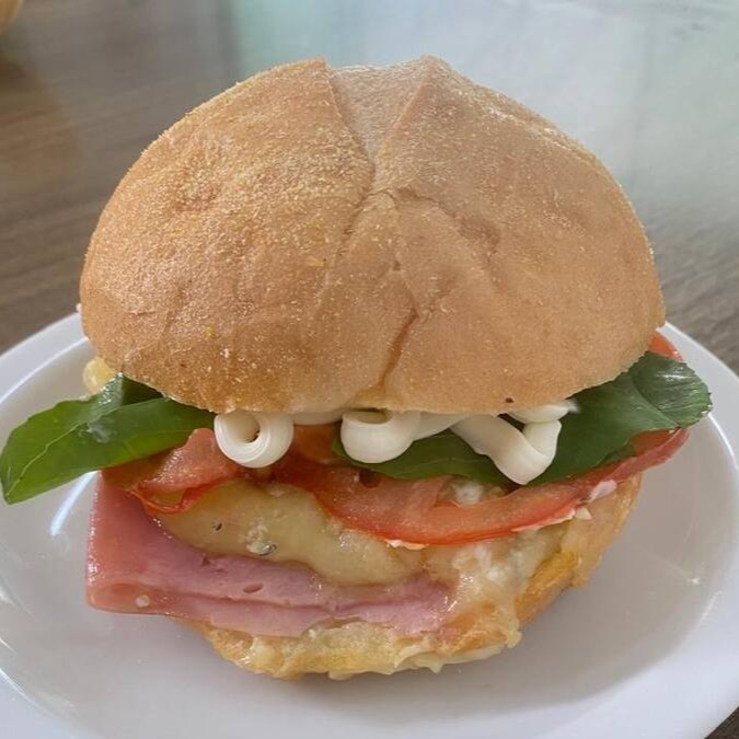 Pão bolinha na manteiga, recheado com cream cheese, presunto, queijo, tomate e rúcula