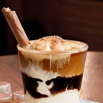 Espresso, chocolate em pó, caramelo salgado, leite espumado e especiarias - canela e noz moscada