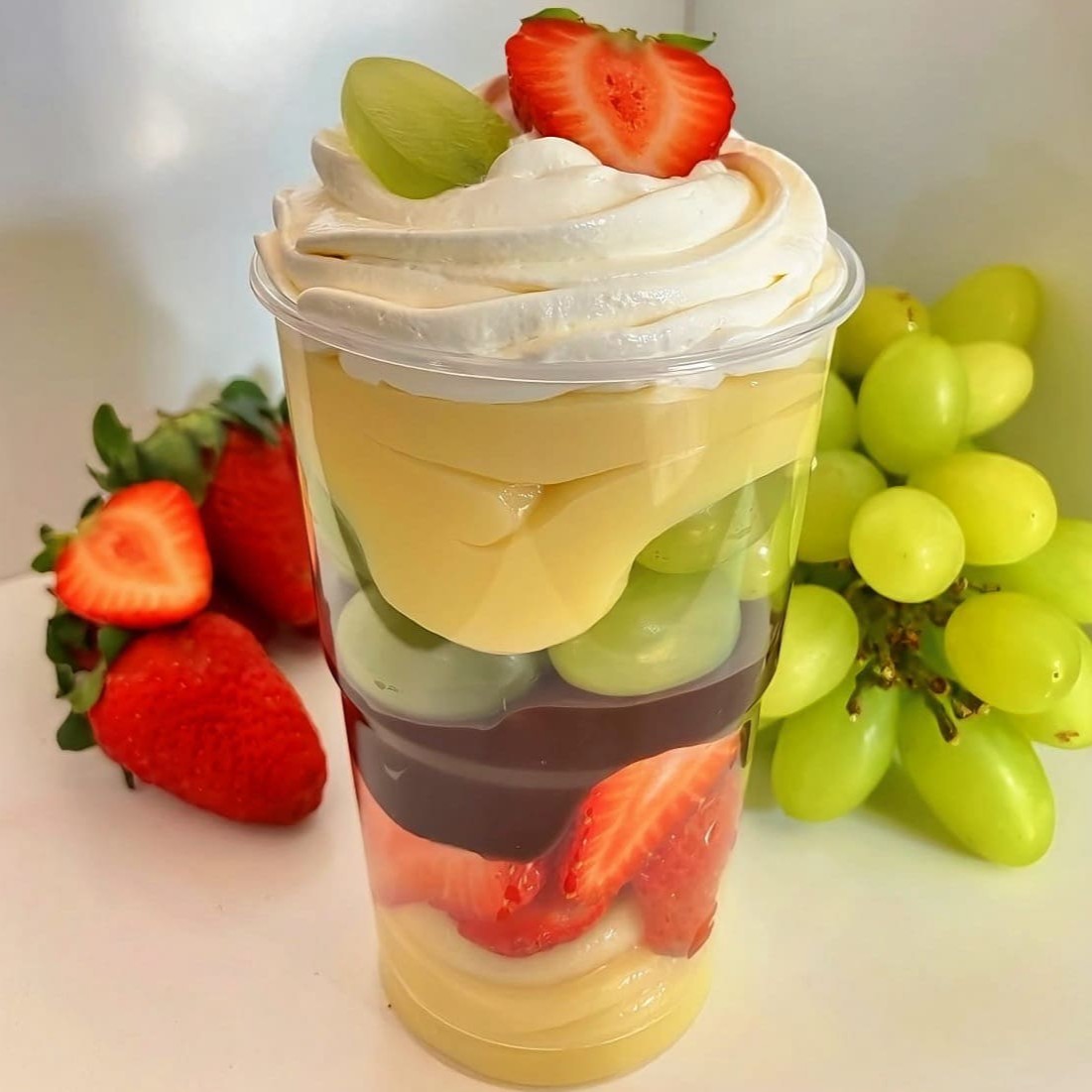 Delicioso copo da felicidade com creme Ninho, Morangos, brigadeiro ao leite, Uvas e coberto com um mousse de Ninho.