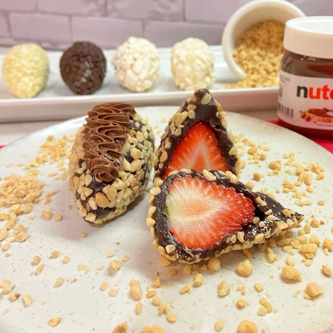 Uma combinação irresistível: coxinha de brigadeiro ao leite, recheada com morango fresco e finalizada com cobertura de Nutella e crocante de amendoim. (Aprox. 70g)