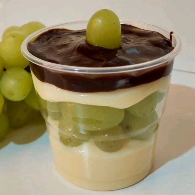 Camadas do nosso delicioso creme de Ninho, Uvas coberta com uma ganache de Chocolate e decorado com uma Uva. Copo 150 ml. Aprox. 200 gramas.