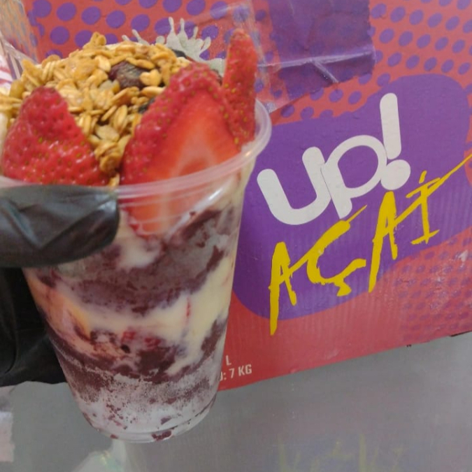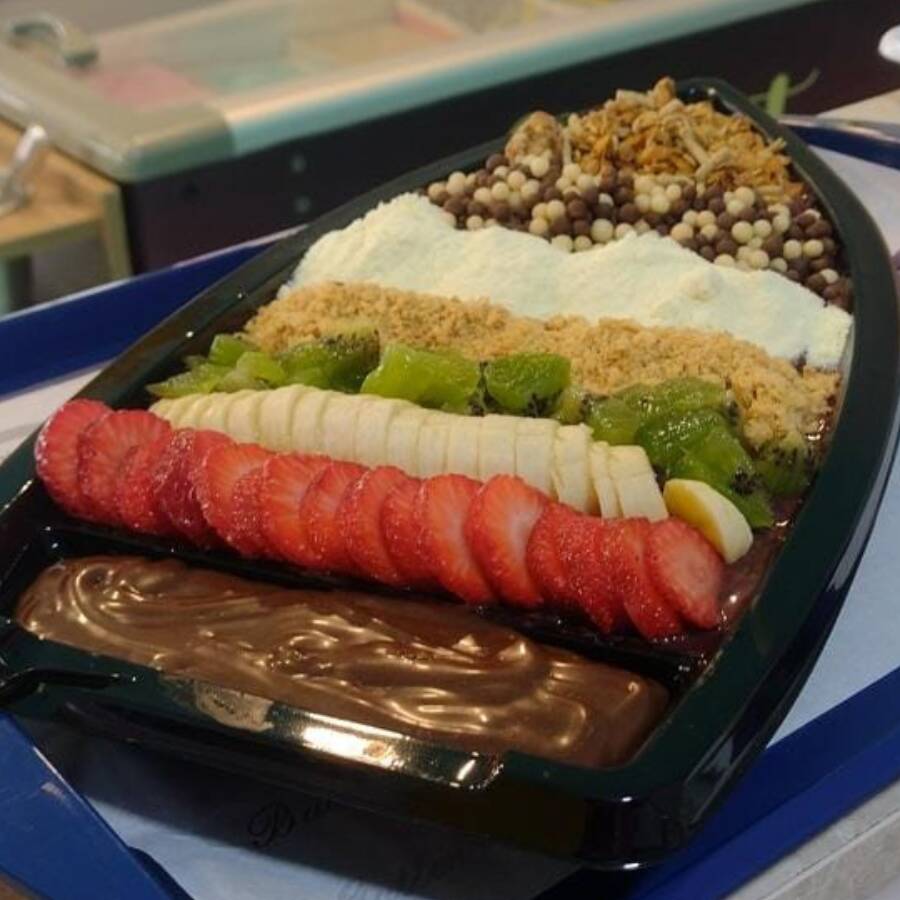 Açaí, morango, banana, granola, leite condensado e leite em pó.