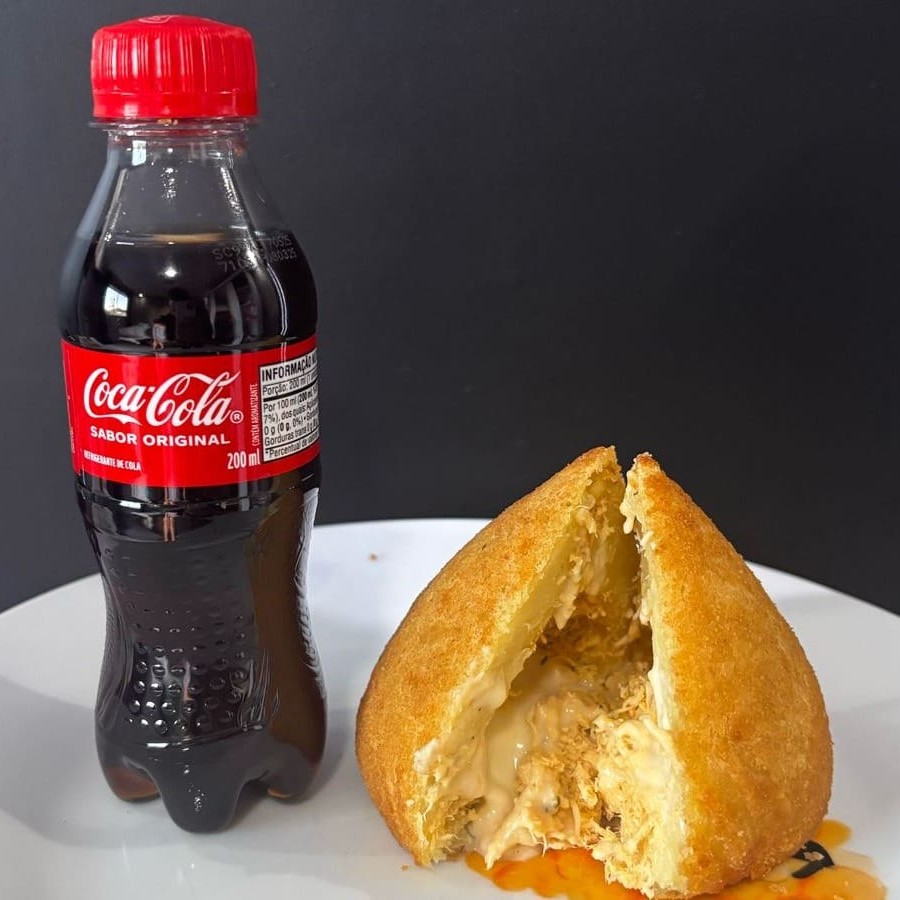 Delicie-se com uma coxinha crocante recheado com frango desfiado e com uma costela desfiada, acompanhado de uma Coca-Cola gelada (200ml). A combinação perfeita para matar a fome com muito sabor!