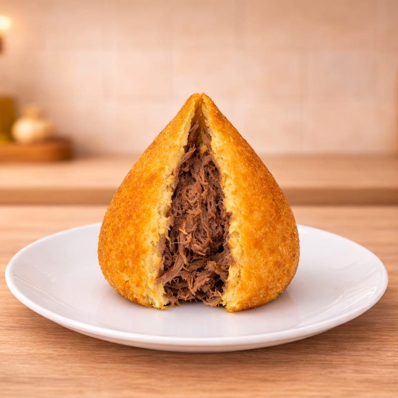 Uma coxinha de costela de 210 gramas, generosa e irresistível. Com uma casquinha dourada e crocante por fora, ela guarda um recheio suculento de costela bovina desfiada, temperada na medida certa com alho, cebola e ervas selecionadas. A massa macia envolve tudo com equilíbrio, criando uma explosão de sabor a cada mordida. Ideal para quem busca um salgado robusto, artesanal e cheio de personalidade.