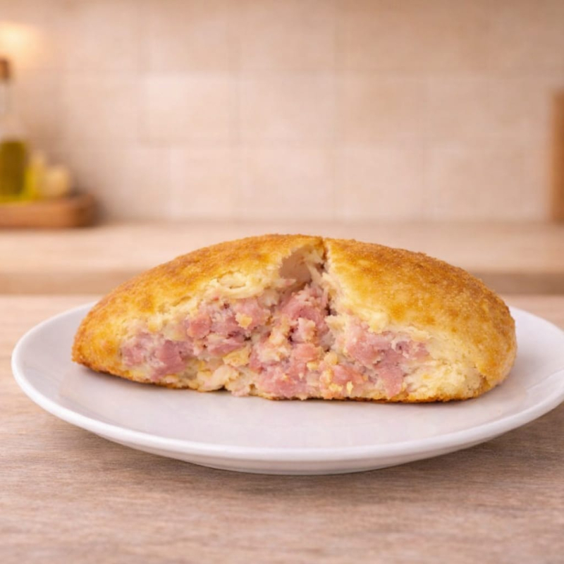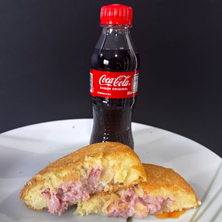 Delicie-se com um risoles crocante recheado com queijo e presunto, acompanhado de uma Coca-Cola gelada (220ml). A combinação perfeita para matar a fome com muito sabor!