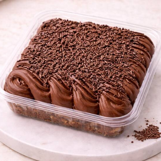 Brownie, coberto com muito creme de chocolate bem cremoso, finalizado com granulado
