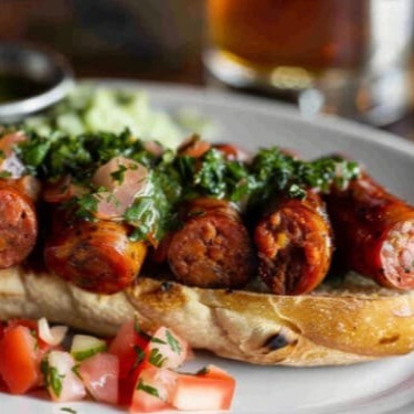 Molho chimichurri, linguiças finas e vinagrete.