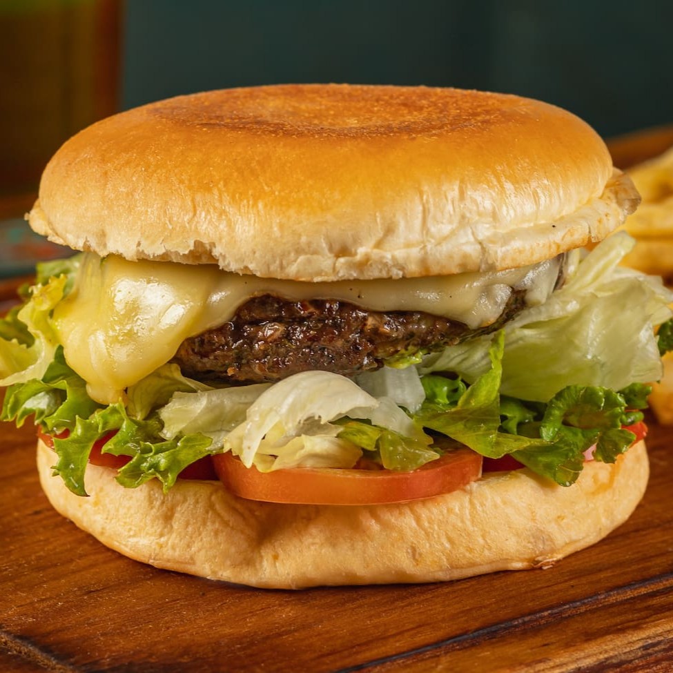 Pão, maionese, 160g de carne, picles, alface, tomate, cebola e queijo.