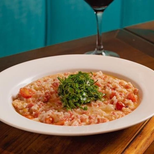 Ragu de linguiça blumenau, com arroz arbóreo e queijo parmesão ao molho sugo.