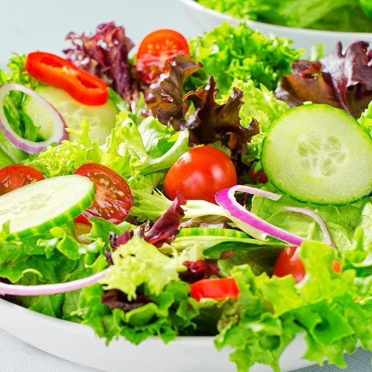 Mix de folhas(alface, couve, agrião), tomate rasteiro, cebola roxa, rabanete e pepino.