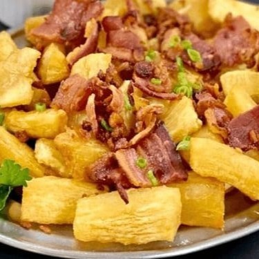 Mandioca frita com bacon.