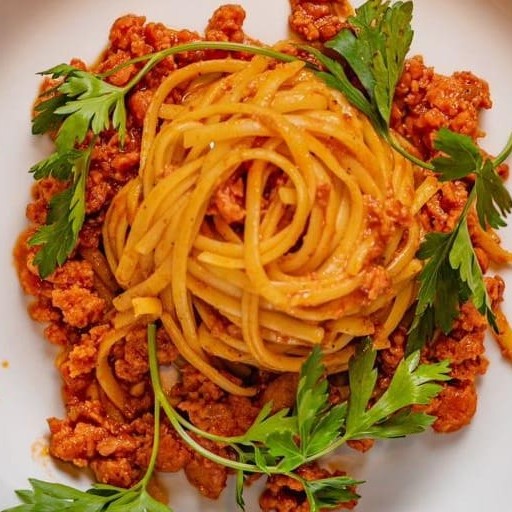 Fettuccine com ragu de linguiça blumenau ao molho sugo.