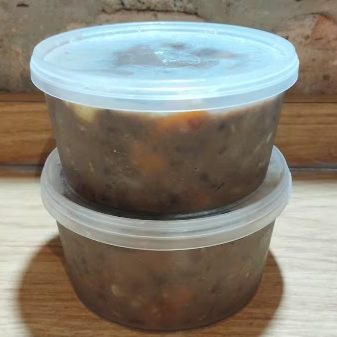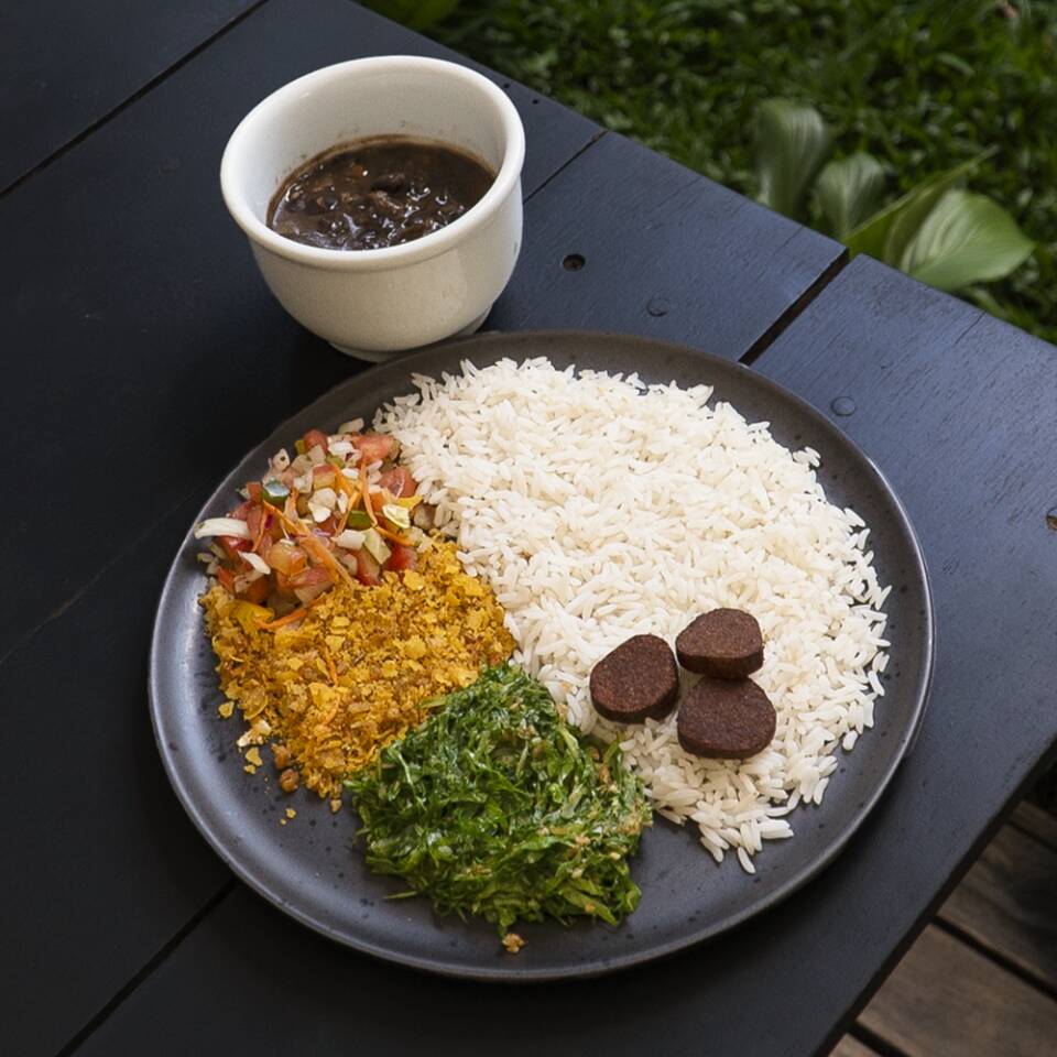 Feijoada Vegana feita com proteína de soja e legumes selecionados — cenoura, abobrinha, cabotiá e batata. Acompanha arroz branco, linguiça vegana frita, farofa de milho temperada e couve refogada no alho.