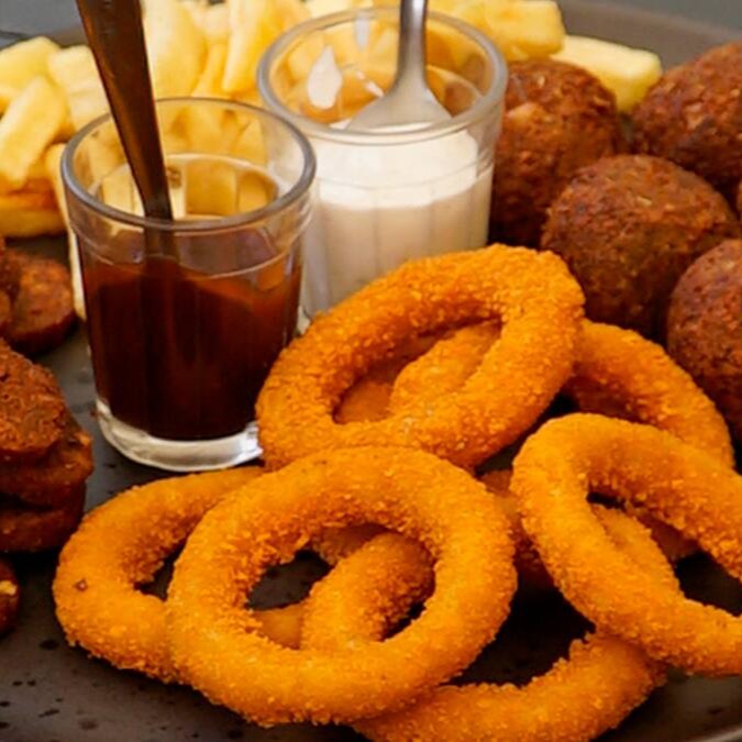 Deliciosa porção com onion rings, falafel, linguiça vegana de Pts e batata frita.