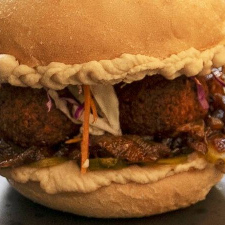 Sanduíche de bolinhos de falafel no pão d’água com maionese vegana, homus, salada mista fresca, picles e cebola caramelizada.