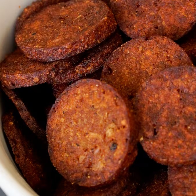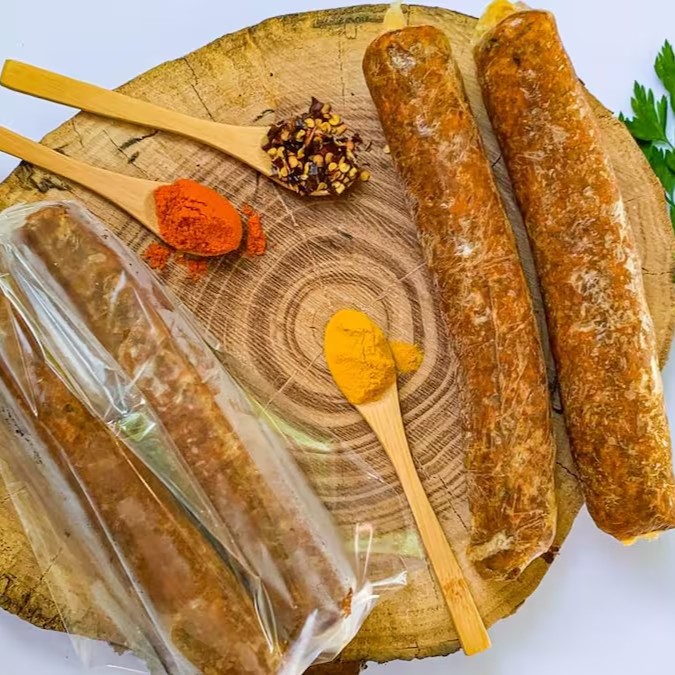 Linguiça à base de soja e polvilho, com sabor que lembra calabresa.