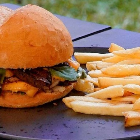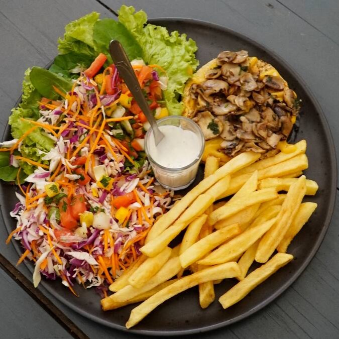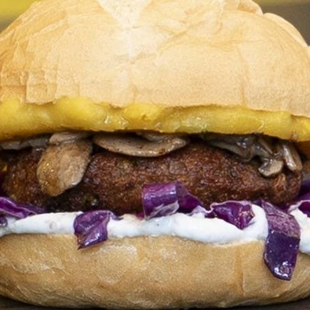 Burger de Batata com Vegetais servido no pão d’água com maionese caseira vegana, cheddar vegano, cogumelos e repolho crocante temperado com alibre.