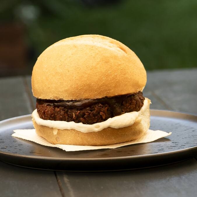 Pão francês com bolinho de Pts frito, maionese vegana e molho barbecue.