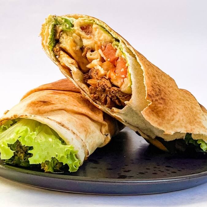 Pão sírio com homus de grão-de-bico, tirinhas de seitan artesanal, alface e tomate fresco, batata frita e maionese vegana.