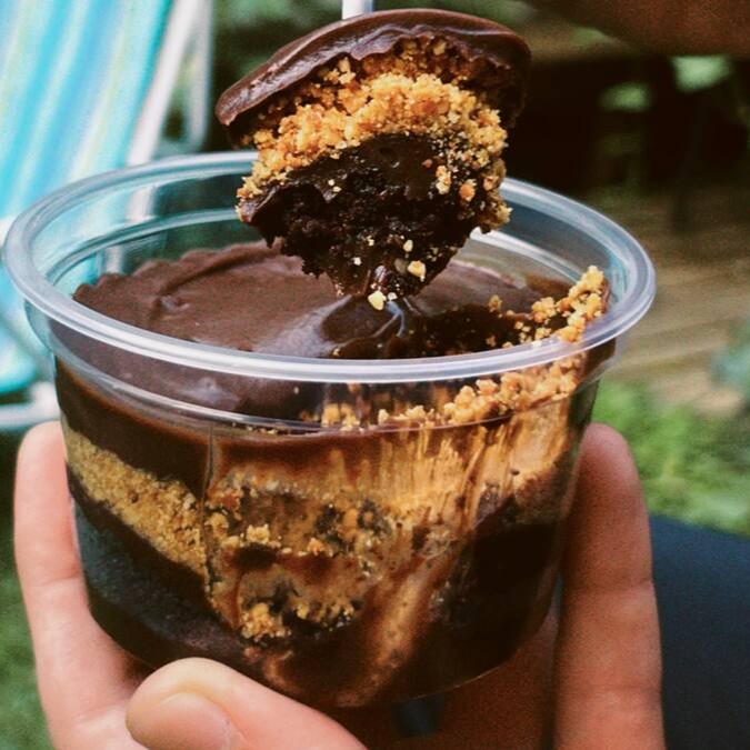 Deliciosas camadas de ganache de chocolate amargo, brownie e paçoca caseira.