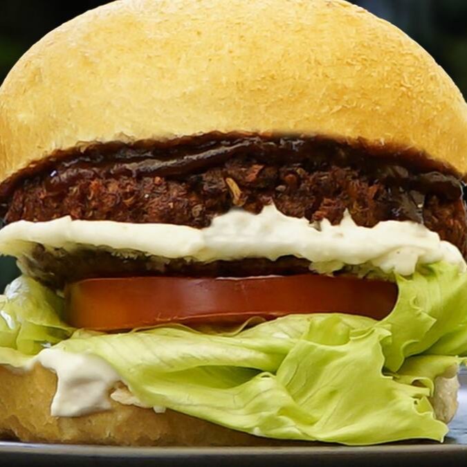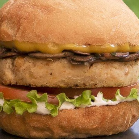 Burger de Grão-de-Bico servido no pão d’água artesanal com maionese vegana, cogumelos salteados no alho e cebola, mostarda amarela, alface crocante e tomate fresco.