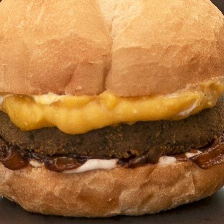 Burger de Lentilha servido no pão d’água com maionese vegana, cheddar vegano e cebola caramelizada.