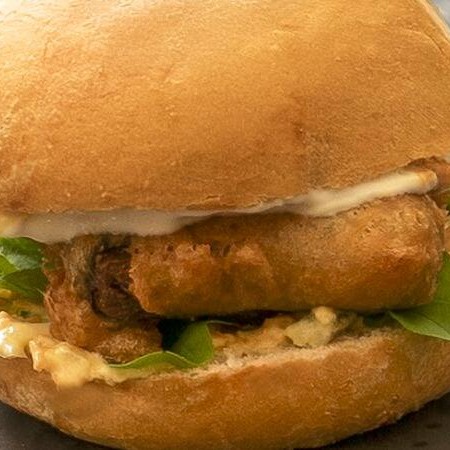 Peixinho vegano empanado de tofu e alga nori, servido no pão de d’água com maionese vegana, molho tártaro e rúcula fresca.