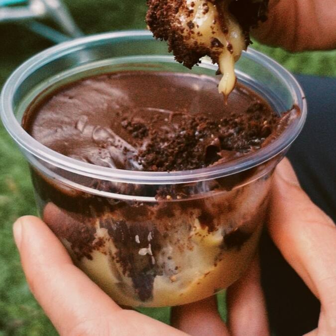 Delicioso dueto que combina creme de baunilha vegano e ganache de chocolate amargo, intercalado com camadas de brownie.