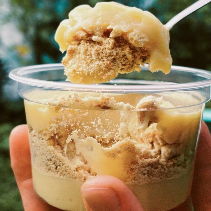 Delicioso banoffee feito com doce de leite de castanha de caju, banana e farofa de bolacha com canela.