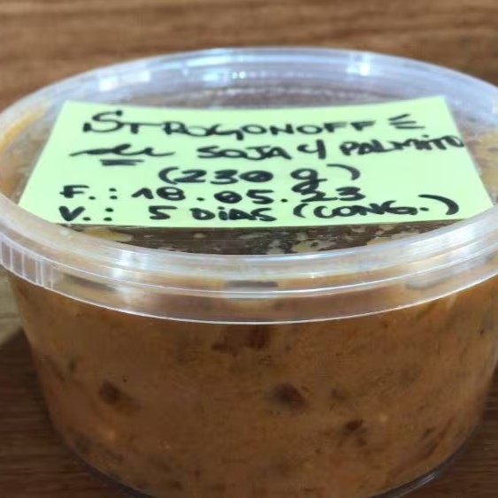 Strogonoff de proteina de soja com molho vermelho, mostarda e tofu.