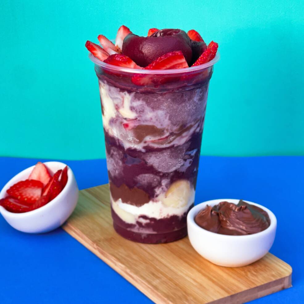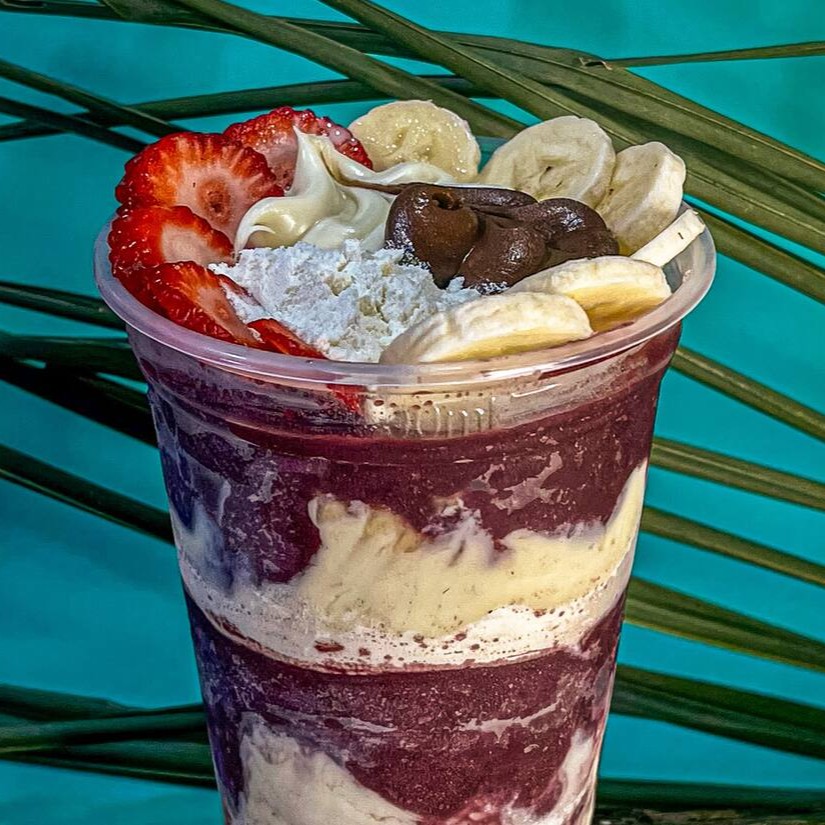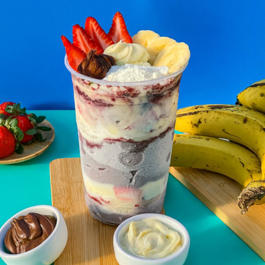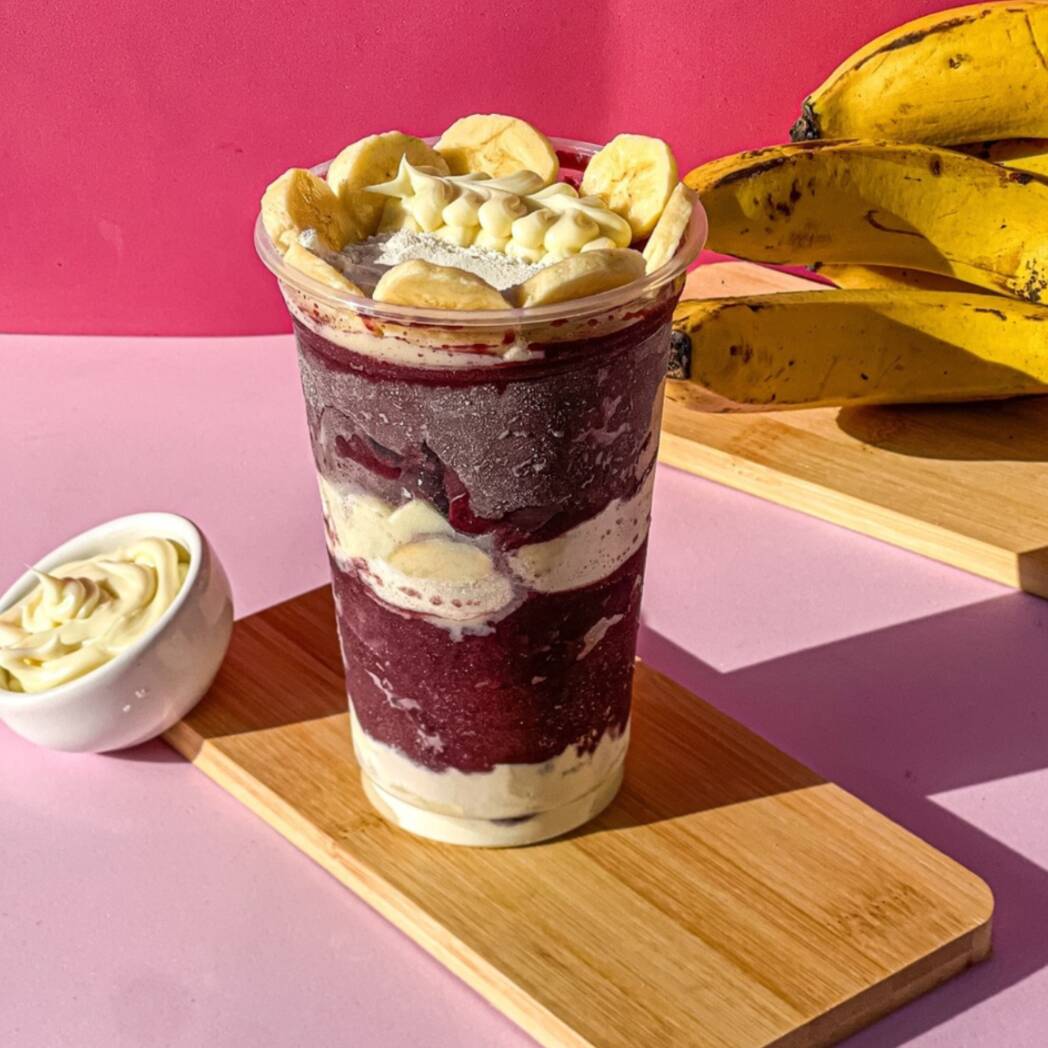 Açaí cremoso, com creme de ninho, bananas frescas, leite condensado e leite em pó.