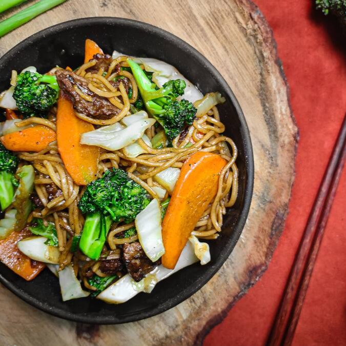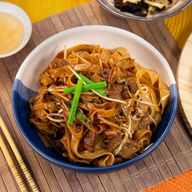 Macarrão de arroz frito, pedaços de carne bovina, acelga e cebolinha verde, ao molho de ostra e shoyu. Adicione uma entrada como complemento, se preferir.
