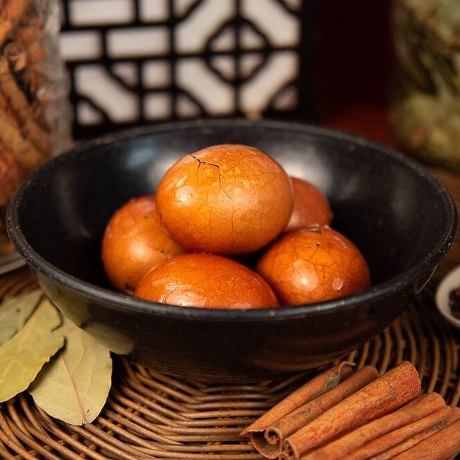 Ovo cozido no molho de shoyu, especiarias e chá preto.