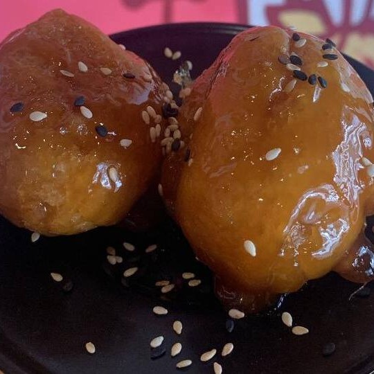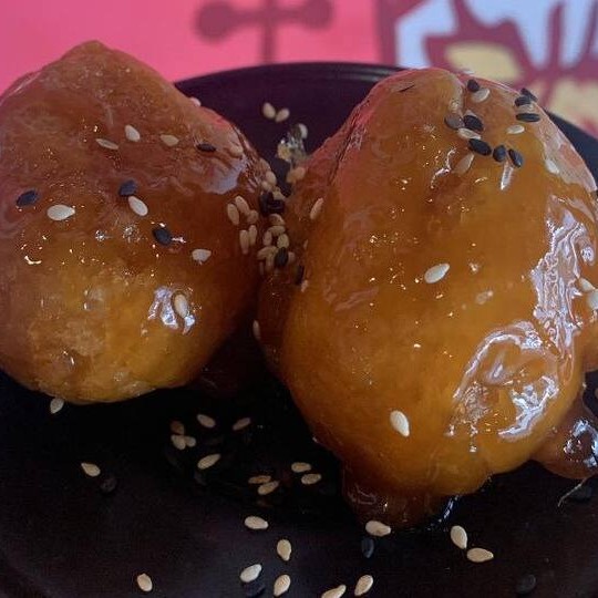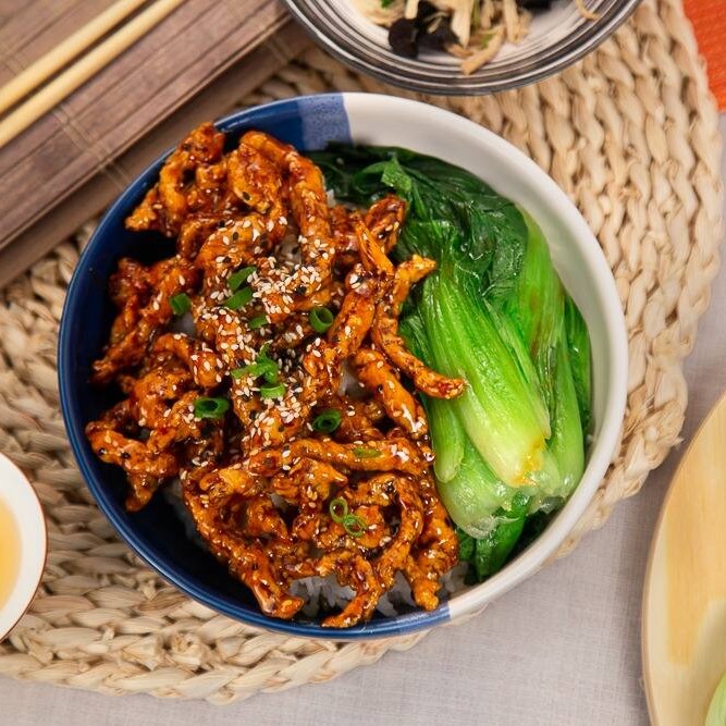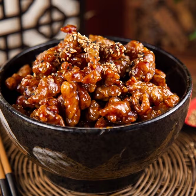 Tiras de lombo suíno fritas, passadas no molho agridoce chinês, com sementes de gergelim torrado por cima.