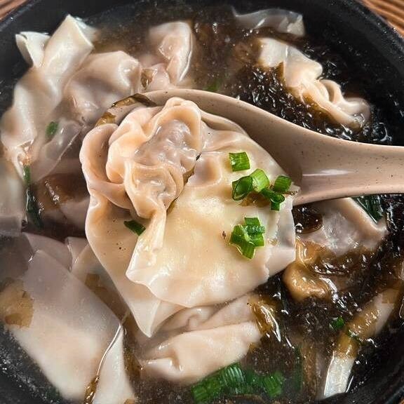6 unidades de Wonton (massa) recheados com carne suína moída, macarrão de trigo, ensopado de alga marinha com camarão pequeno.