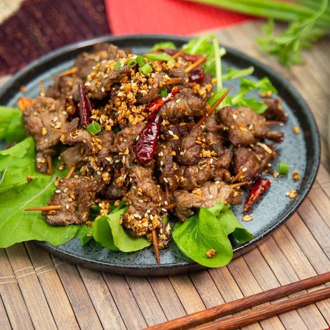 Deliciosas lascas de carne no espeto com tempero especial chinês, levemente apimentado. Alho torrado por cima.