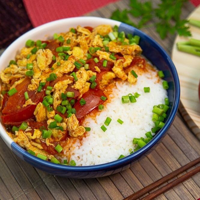 Ovo com tomate com tempero especial, acompanhado de arroz branco.