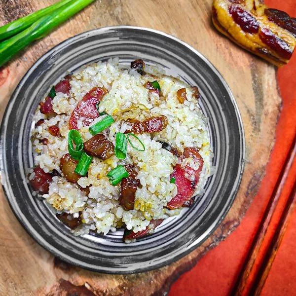 Arroz moji frito com linguiça chinesa, bacon temperado, ervilha e cebolinha verde.