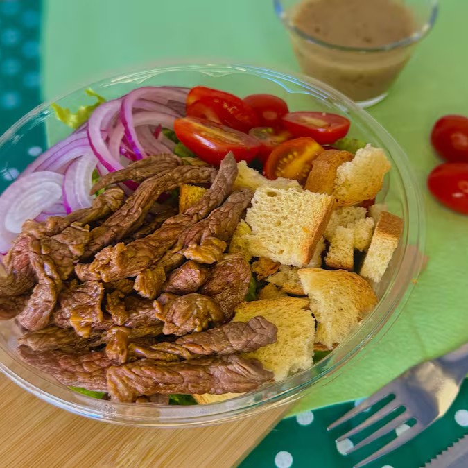 Frescas folhas de alface, cebola fatiada, tomates cereja, deliciosos croutons e suculentas tiras de Alcatra grelhada, tudo regado com molho especial. Uma explosão de sabores frescos e irresistíveis!