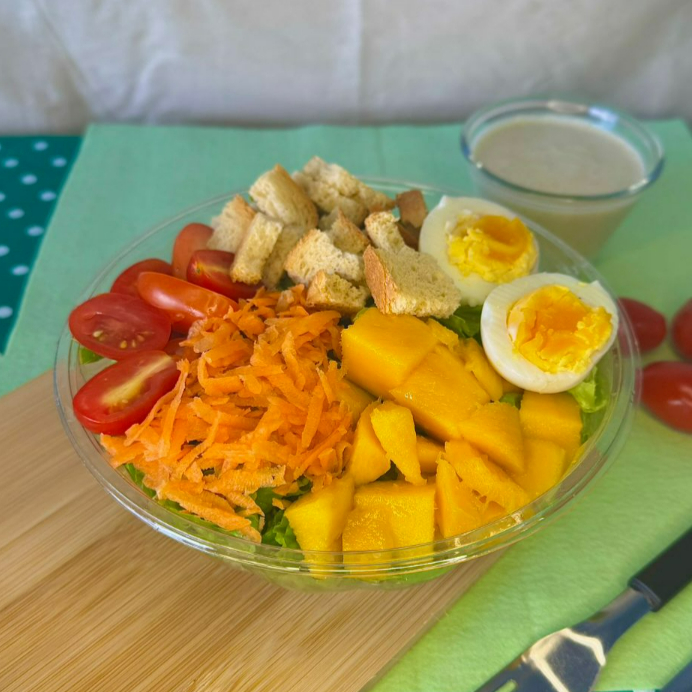 Um combinado de ingredientes trazendo uma explosão de frescor e sabor. Acompanha folhas de alface fresquinha, deliciosos cubos de manga, tomate cereja, deliciosos croutons, cenoura ralada e dois ovos cozidos. Com um de nossos deliciosos molhos.