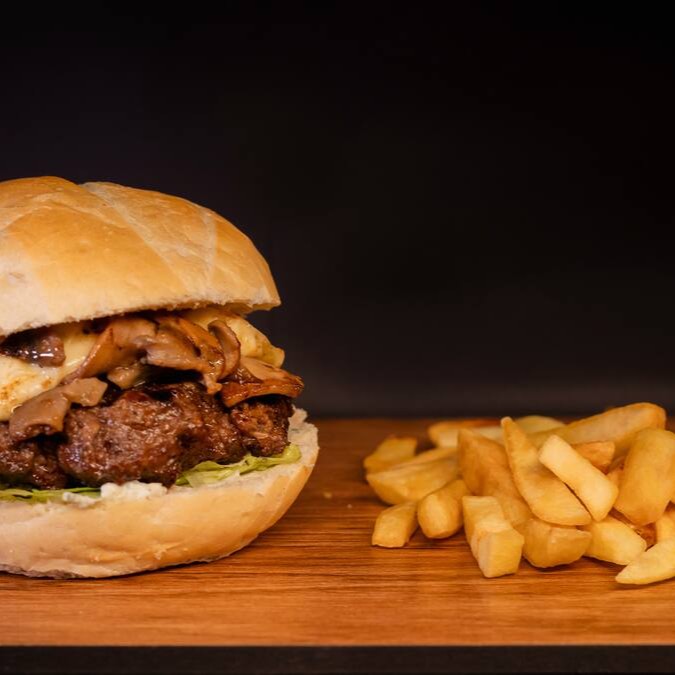 Pão crocante, maionese da casa, hambúrguer 170g, alface, cogumelos paris temperados e salteados, mussarela. Acompanhamento de fritas.