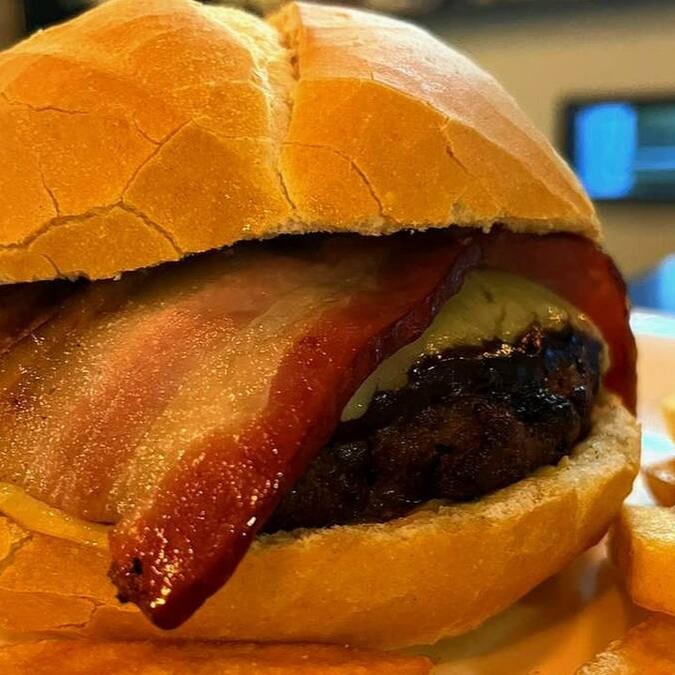 Pão crocante, maionese da casa, hambúrguer 170g, queijo provolone, bacon e molho barbecue Acompanhamento de fritas.