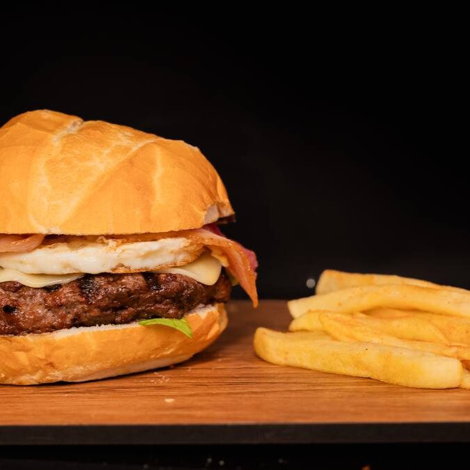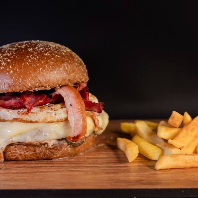 Pão crocante, maionese da casa, hambúrguer 170g, tomate, alface, mussarela, ovo frito, bacon. Acompanhamento de fritas.