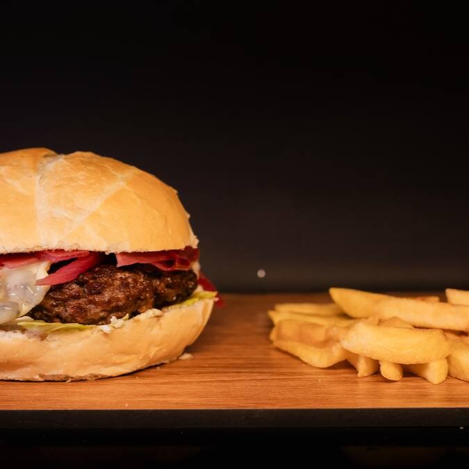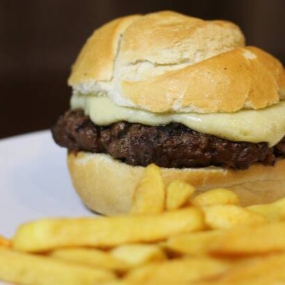 Pão crocante, maionese da casa, hambúrguer 100g, mussarela e Acompanha batata Frita.