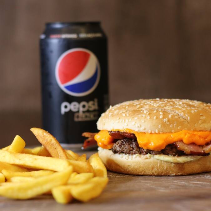 Pão brioche, maionese da casa, 3 hamburgueres de 100g cada prensados na chapa, queijo cheddar e bacon. Acompanha Fritas