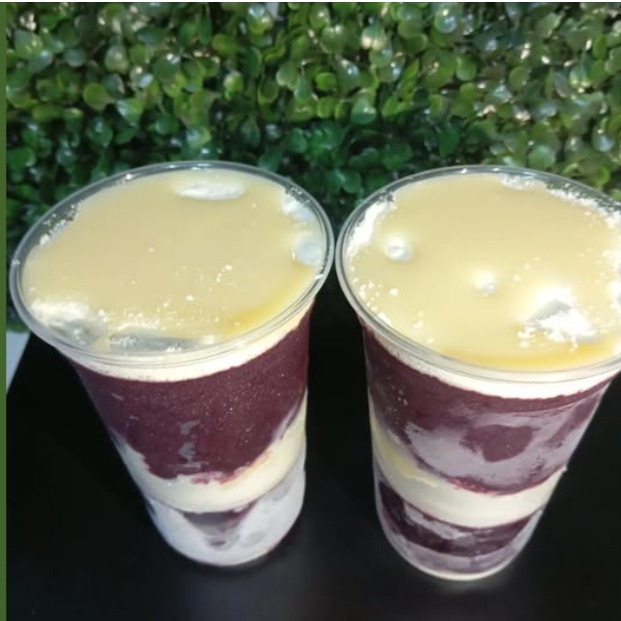 Dois copos de 500ml, com Açaí, uva verde sem semente, leite condensado e leite em pó.