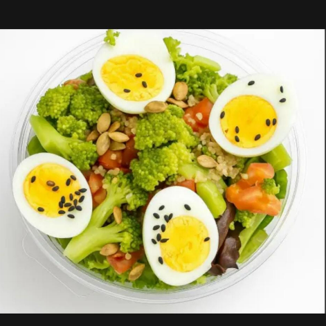 Alface, brócolis, tomate, quinoa e sementes, ovos cozidos.