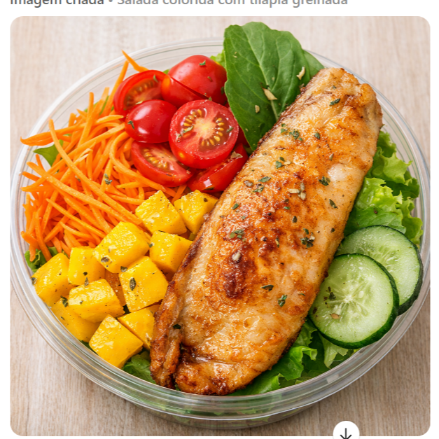 Alface, rúcula, pepino, manga, cenoura, tomate, tilápia grelhada.