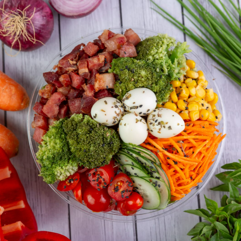 Bacon, milho, brócolis, pepino, tomate, cenoura e ovos de codorna. Acompanha molho mostarda e mel.