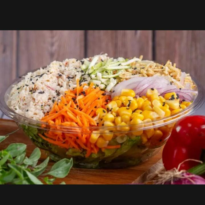 Frango desfiado, milho, abobrinha, cenoura, batata palha. Acompanha molho Ranch.